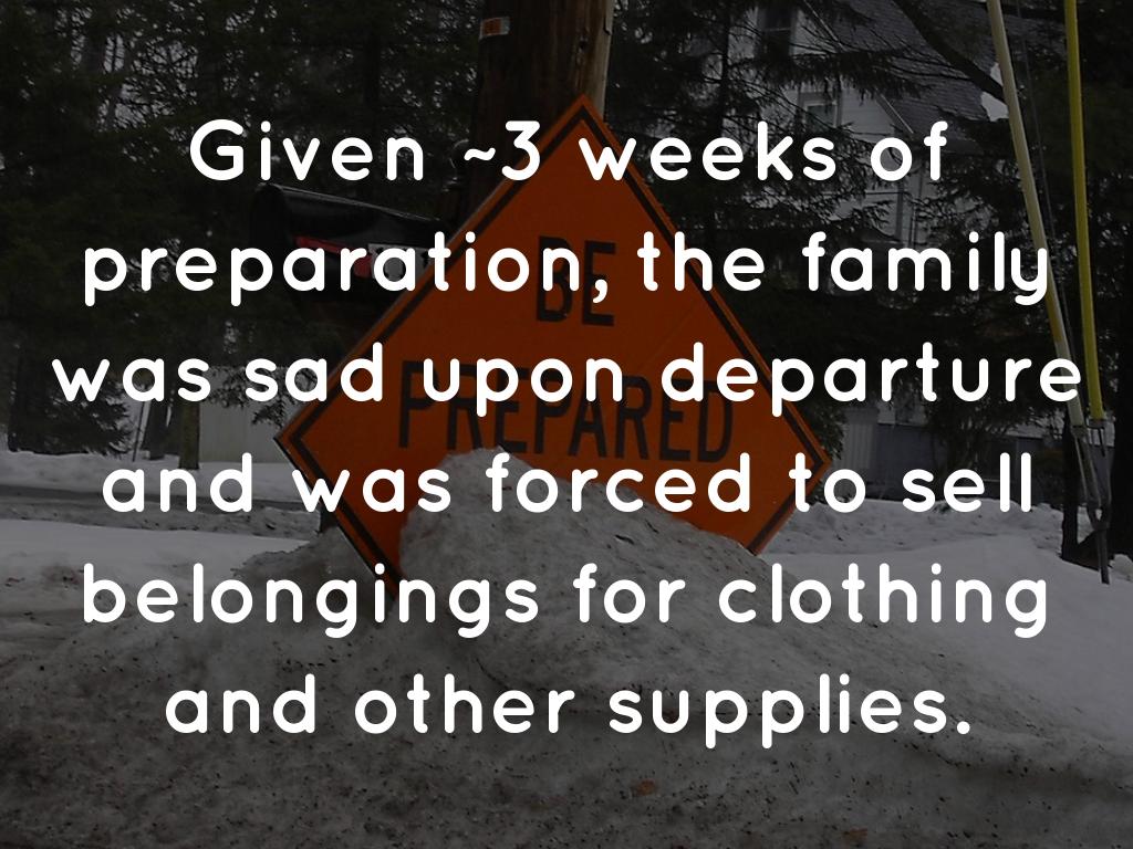 Given ~3 weeks of preparation, the family was sad upon departure and was forced to sell belongings for clothing and other supplies.