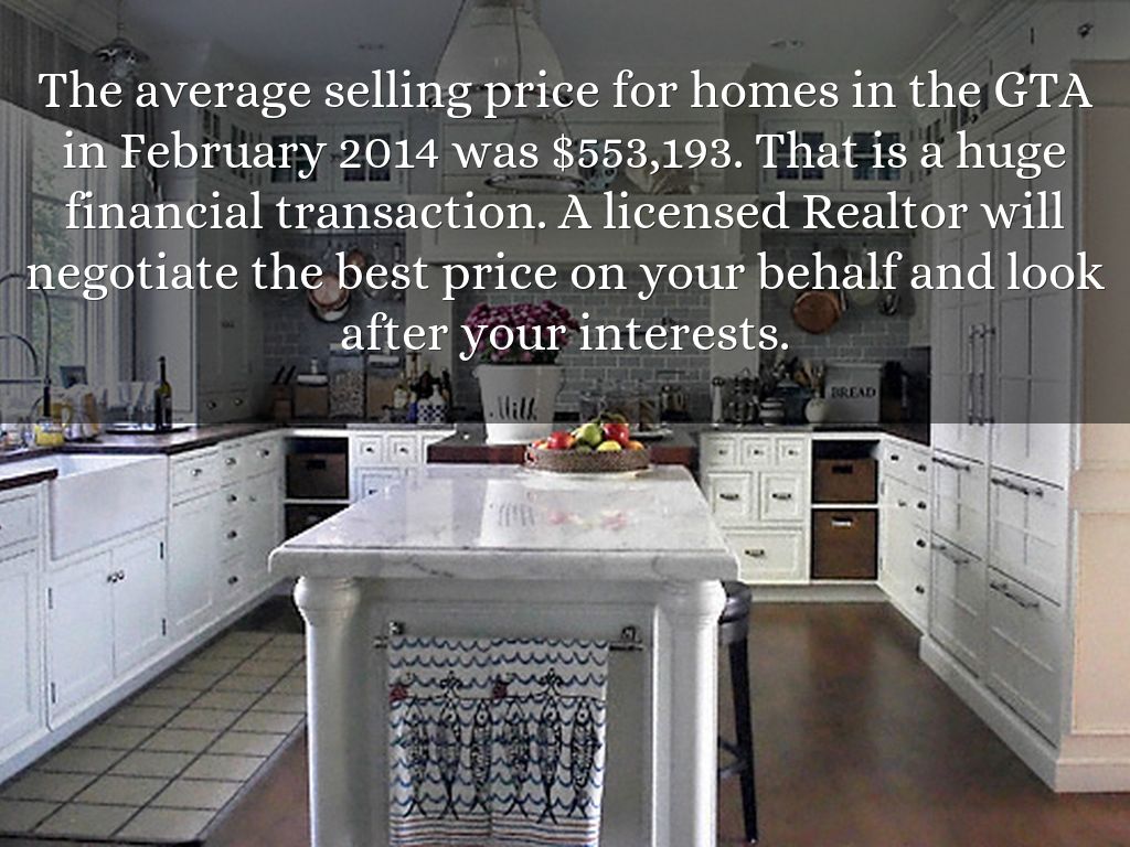 The average selling price for homes in the GTA in February 2014 was $553,193. That is a huge financial transaction. A licensed Realtor will negotiate the best price on your behalf and look after your interests.