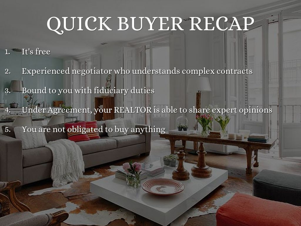 Under a Buyer Representation Agreement, your Realtor is bound to you with fiduciary duties, (loyalty, obedience, full disclosure, duty to use skill, care and diligence, duty to account for all monies) and protects your information.
