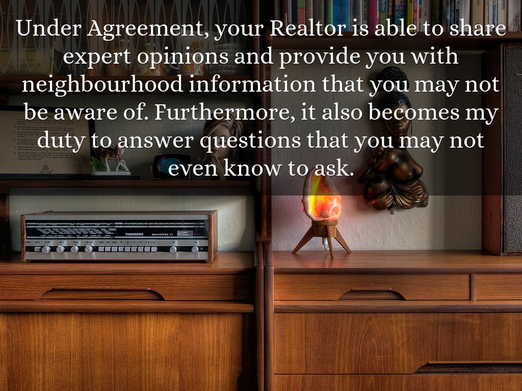 Under Agreement, your Realtor is able to share expert opinions and provide you with neighbourhood information that you may not be aware of. Furthermore, it also becomes my duty to answer questions that you may not even know to ask.