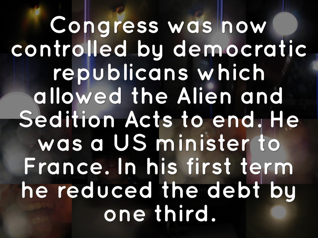 Congress was now controlled by democratic republicans which allowed the Alien and Sedition Acts to end. He was a US minister to France. In his first term he reduced the debt by one third.