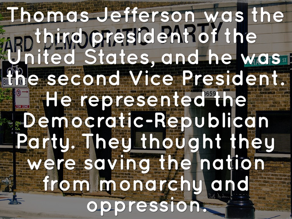 Thomas Jefferson was the third president of the United States, and he was the second Vice President. He represented the Democratic-Republican Party. They thought they were saving the nation from monarchy and oppression.