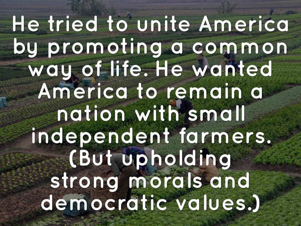 He tried to unite America by promoting a common way of life. He wanted America to remain a nation with small independent farmers. (But upholding strong morals and democratic values.)