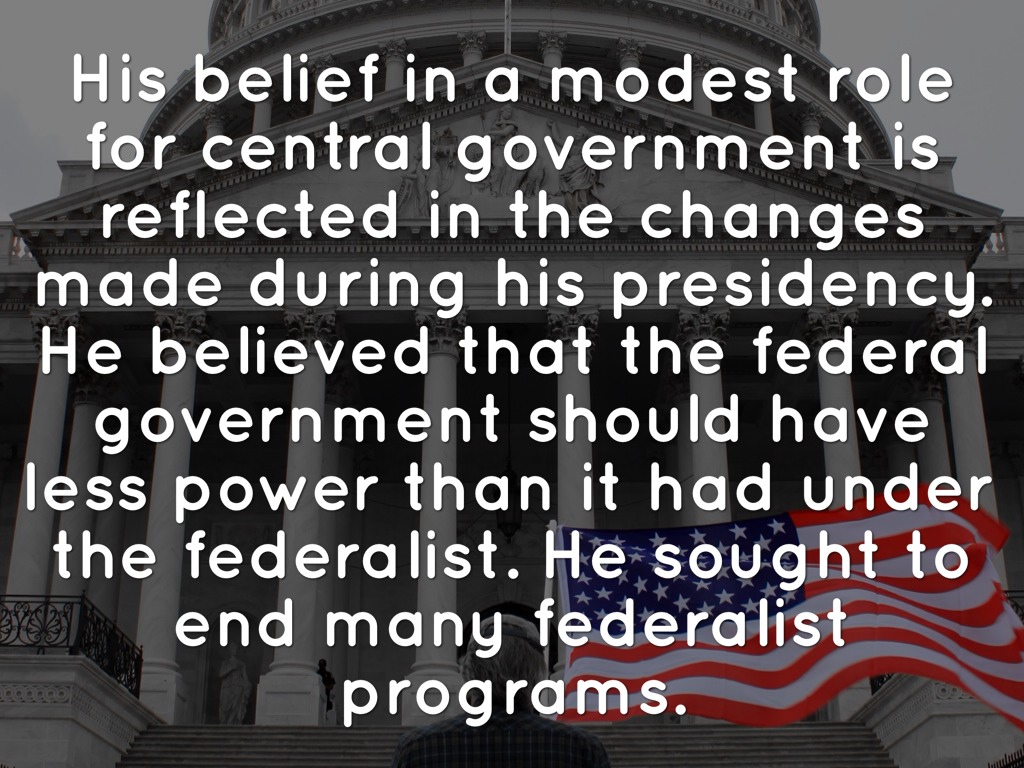 His belief in a modest role for central government is reflected in the changes made during his presidency. He believed that the federal government should have less power than it had under the federalist. He sought to end many federalist programs.