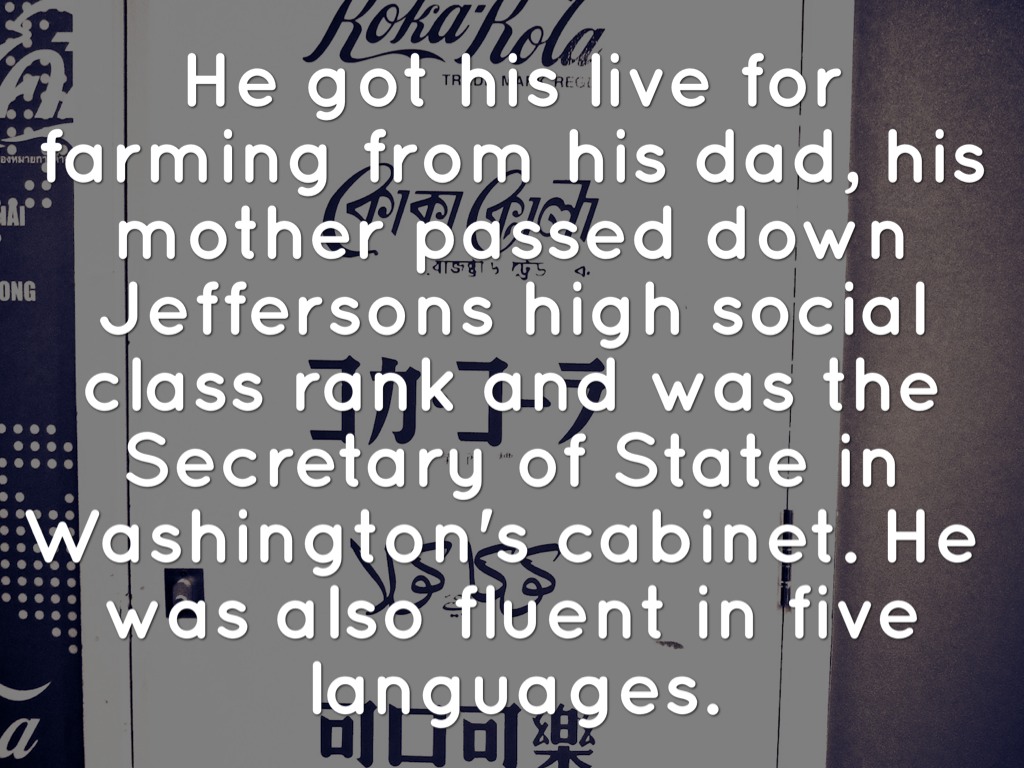 He got his live for farming from his dad, his mother passed down Jeffersons high social class rank and was the Secretary of State in Washington's cabinet. He was also fluent in five languages.