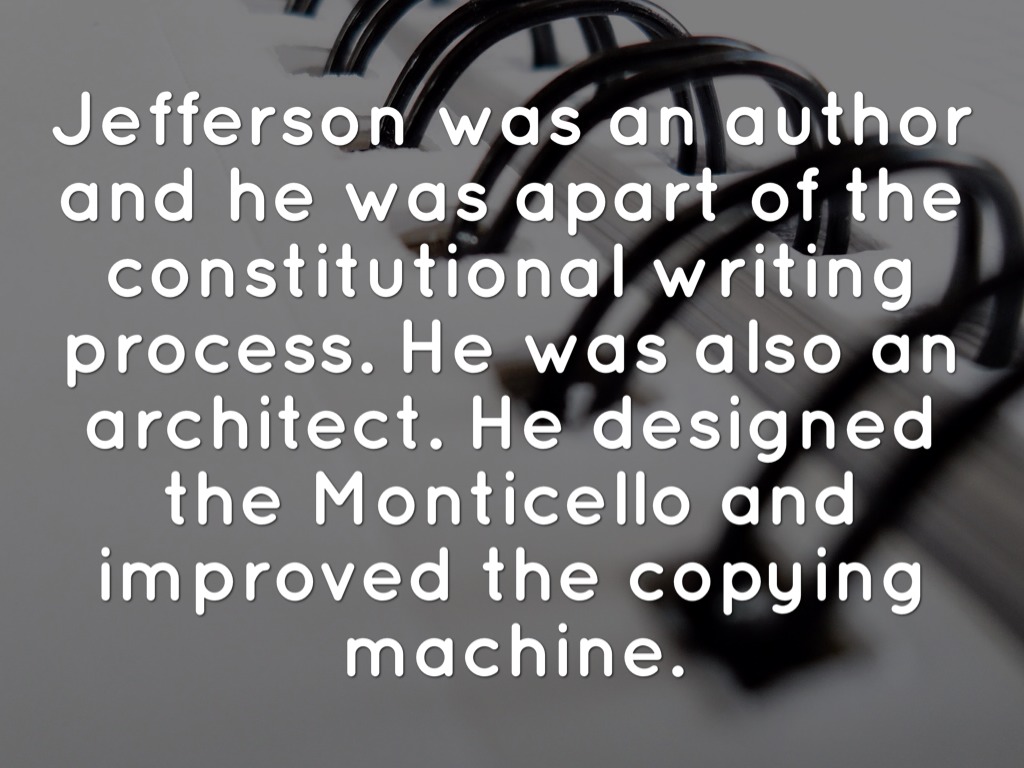 Jefferson was an author and he was apart of the constitutional writing process. He was also an architect. He designed the Monticello and improved the copying machine.