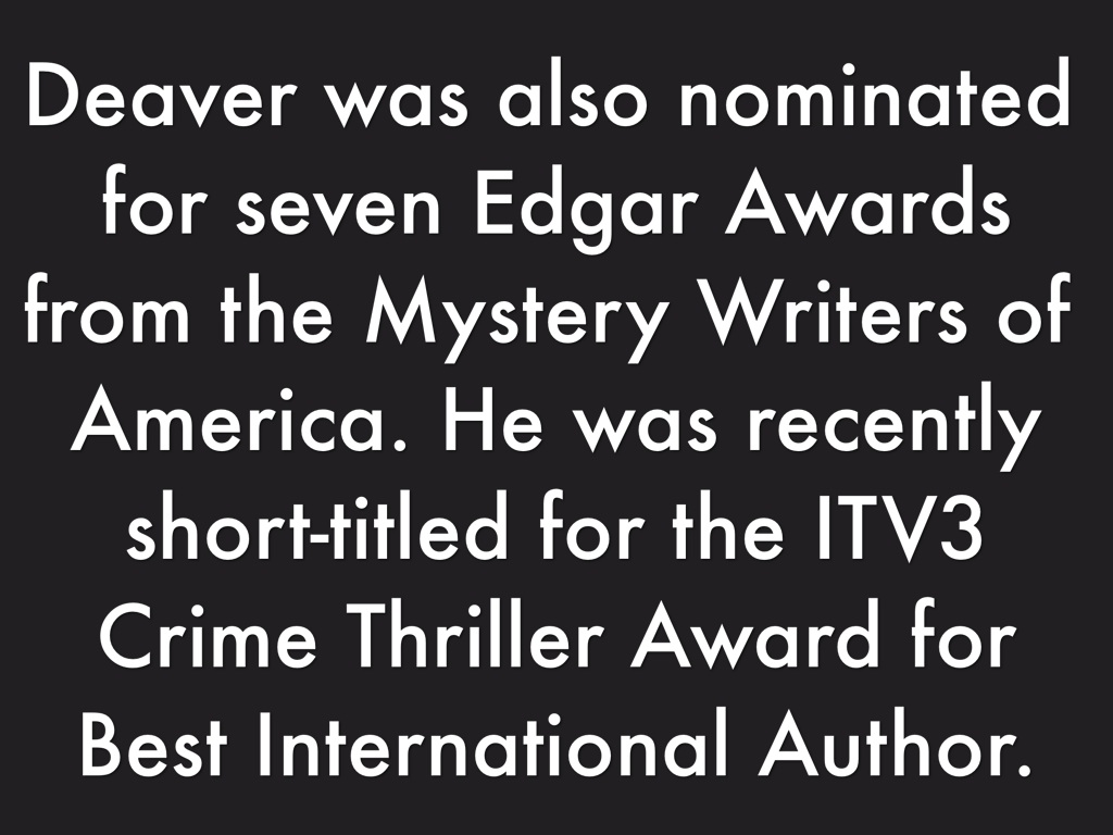 Deaver was also nominated for seven Edgar Awards from the Mystery Writers of America. He was recently short-titled for the ITV3 Crime Thriller Award for Best International Author.