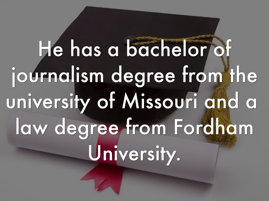 He has a bachelor of journalism degree from the university of Missouri and a law degree from Fordham University.