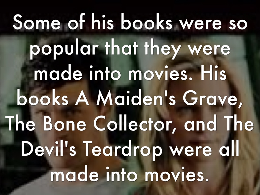 Some of his books were so popular that they were made into movies. His books A Maiden's Grave, The Bone Collector, and The Devil's Teardrop were all made into movies.