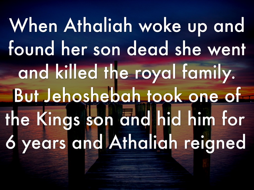When Athaliah woke up and found her son dead she went and killed the royal family. But Jehoshebah took one of the Kings son and hid him for 6 years and Athaliah reigned