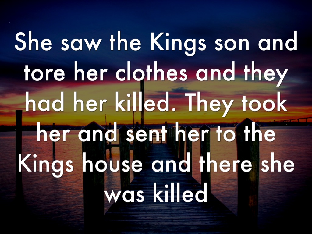 She saw the Kings son and tore her clothes and they had her killed. They took her and sent her to the Kings house and there she was killed