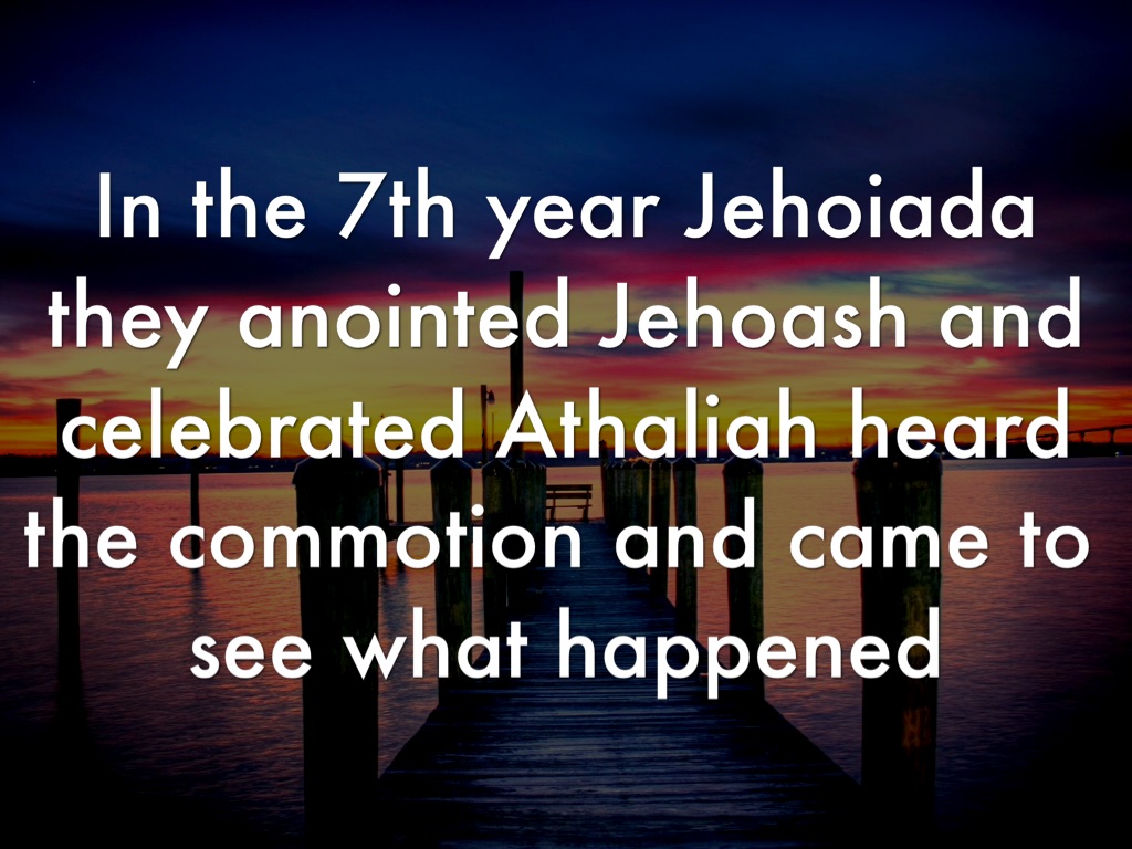 In the 7th year Jehoiada they anointed Jehoash and celebrated Athaliah heard the commotion and came to see what happened