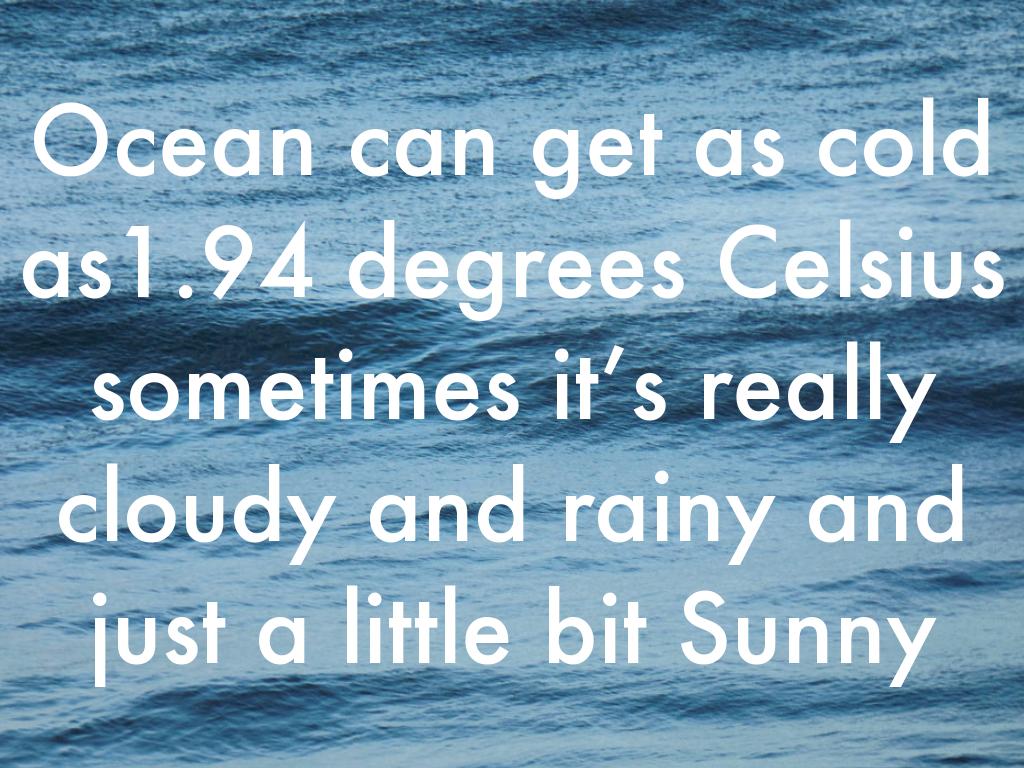 Ocean can get as cold as1.94 degrees Celsius sometimes it’s really cloudy and rainy and just a little bit Sunny