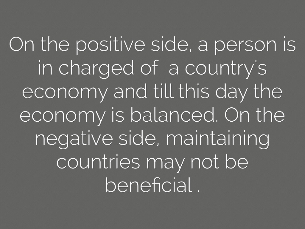 On the positive side, a person is in charged of a country's economy and till this day the economy is balanced. On the negative side, maintaining countries may not be beneficial .