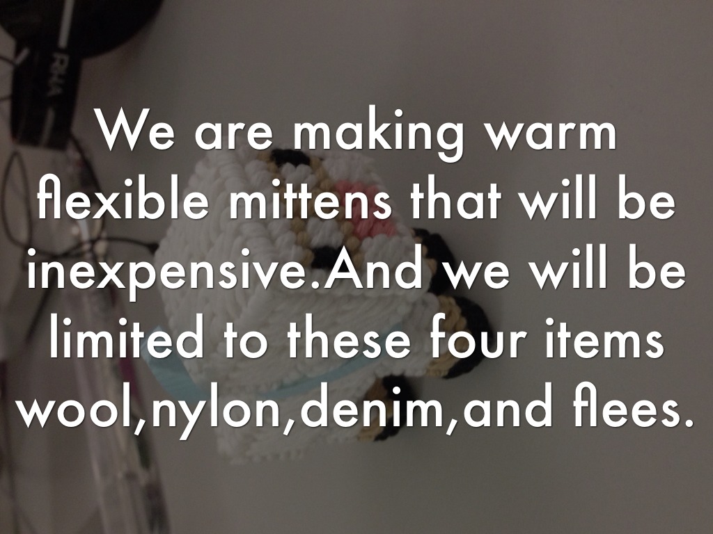 We are making warm flexible mittens that will be inexpensive.And we will be limited to these four items wool,nylon,denim,and flees.