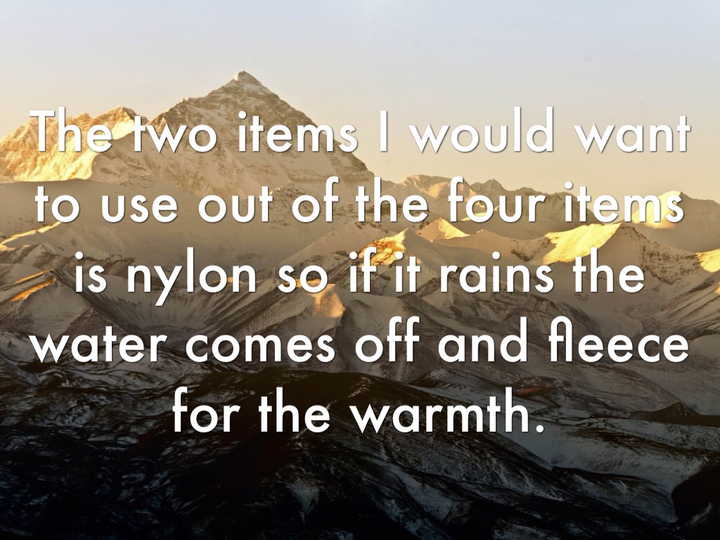 The two items I would want to use out of the four items is nylon so if it rains the water comes off and fleece for the warmth.