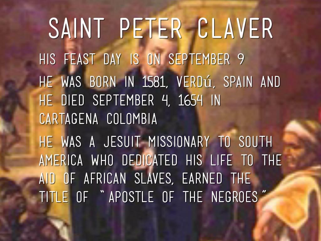 He was a jesuit missionary to South America who dedicated his life to the aid of African slaves, earned the title of “apostle of the Negroes”