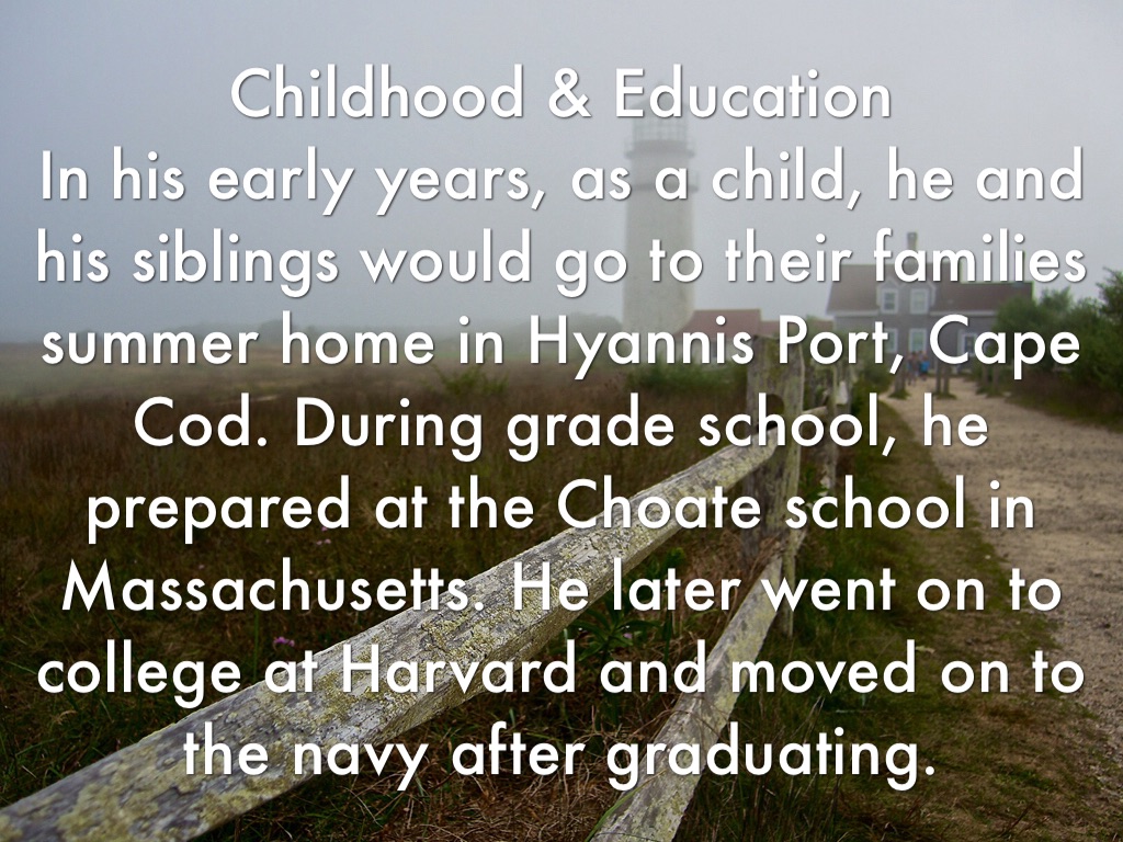 In his early years, as a child, he and his siblings would go to their families summer home in Hyannis Port, Cape Cod. During grade school, he prepared at the Choate school in Massachusetts. He later went on to college at Harvard and moved on to the navy after graduating.