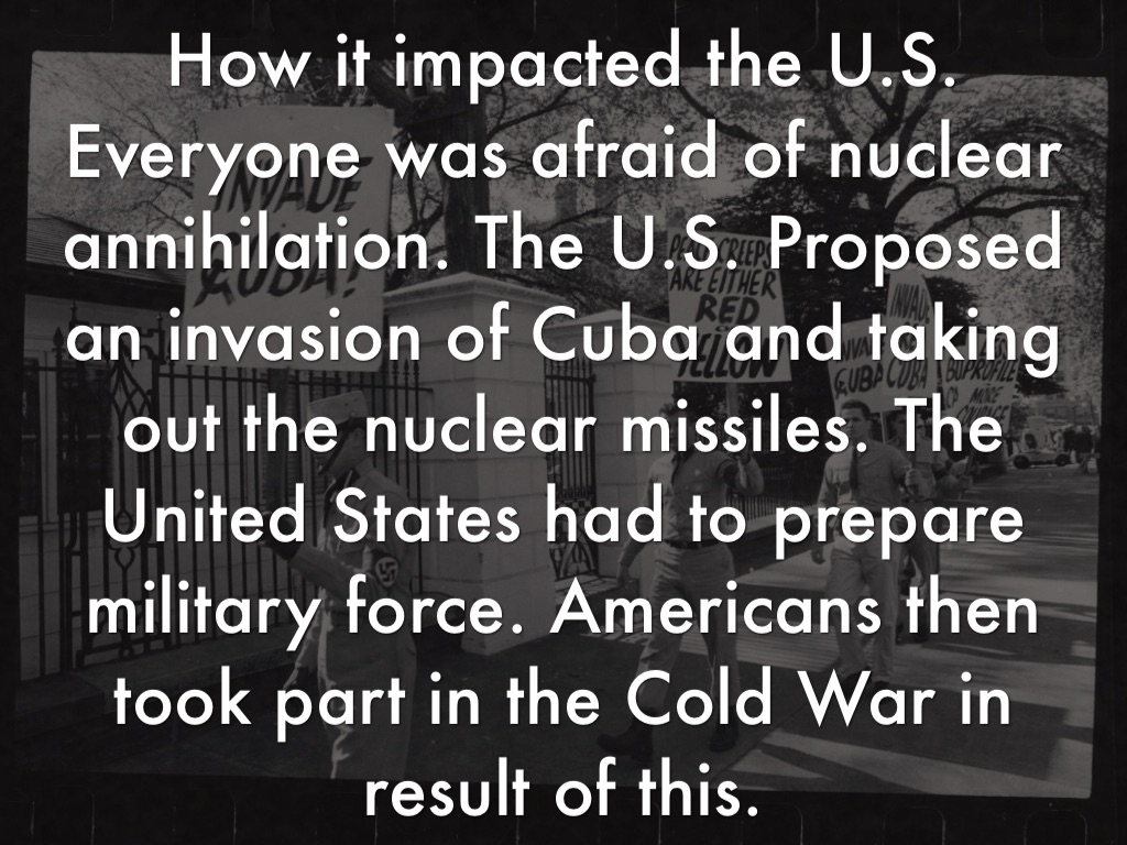 Everyone was afraid of nuclear annihilation. The U.S. Proposed an invasion of Cuba and taking out the nuclear missiles. The United States had to prepare military force. Americans then took part in the Cold War in result of this.