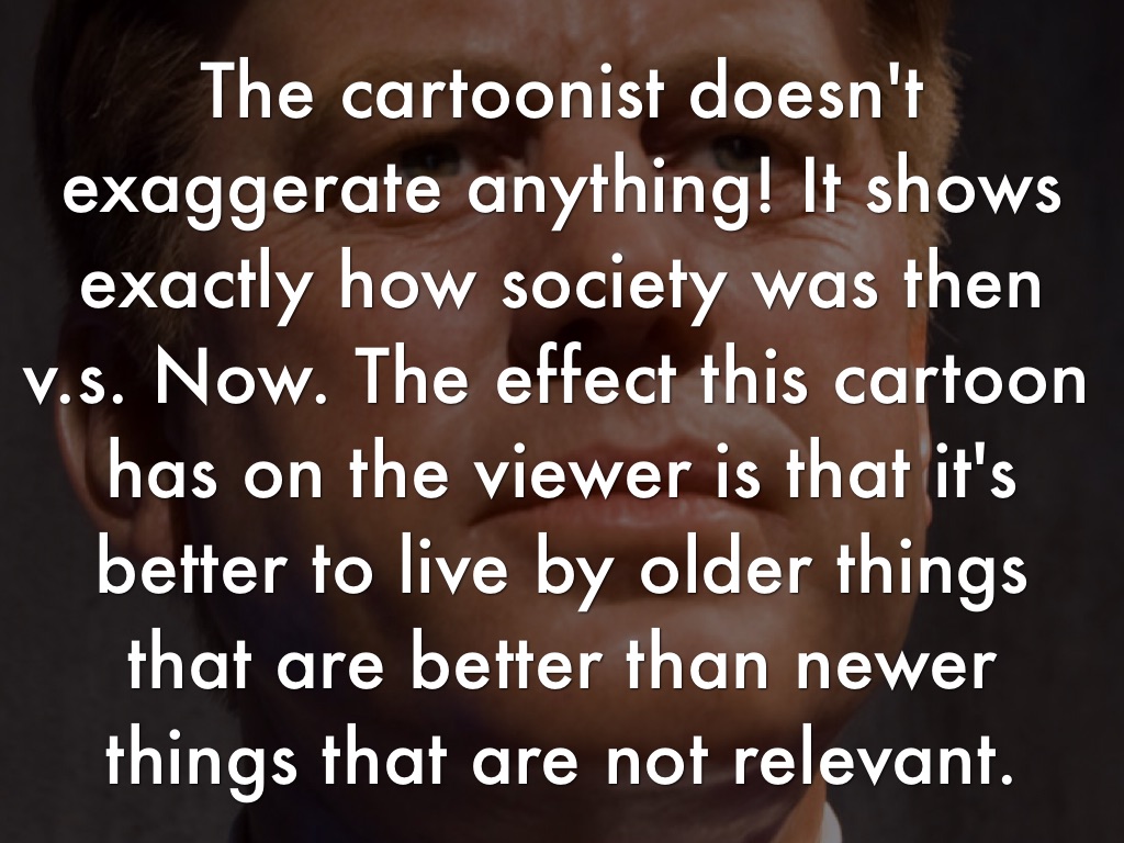 The cartoonist doesn't exaggerate anything! It shows exactly how society was then v.s. Now. The effect this cartoon has on the viewer is that it's better to live by older things that are better than newer things that are not relevant.