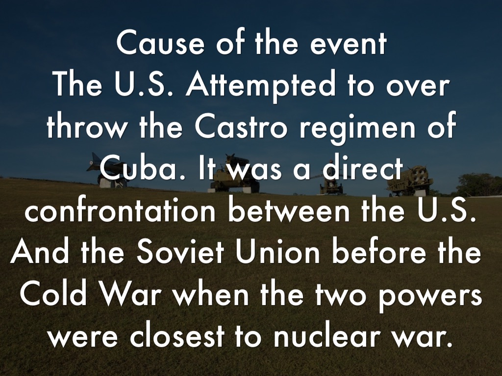 The U.S. Attempted to over throw the Castro regimen of Cuba. It was a direct confrontation between the U.S. And the Soviet Union before the Cold War when the two powers were closest to nuclear war.