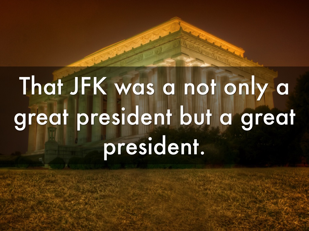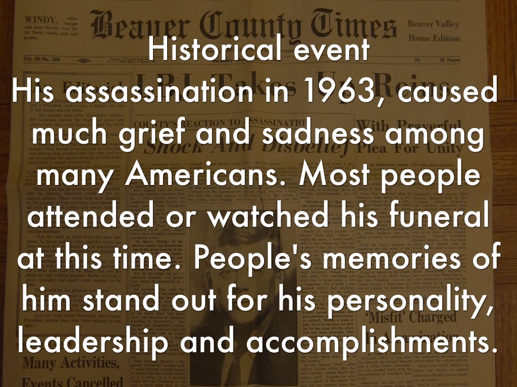 His assassination in 1963, caused much grief and sadness among many Americans. Most people attended or watched his funeral at this time. People's memories of him stand out for his personality, leadership and accomplishments.