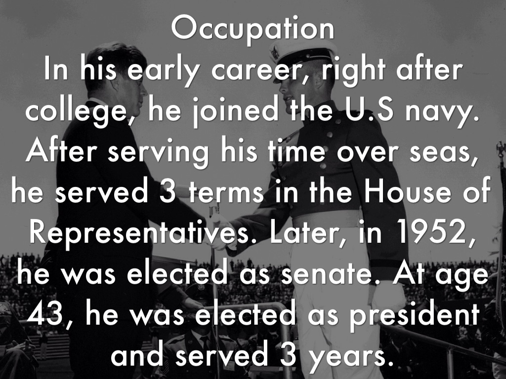 In his early career, right after college, he joined the U.S navy. After serving his time over seas, he served 3 terms in the House of Representatives. Later, in 1952, he was elected as senate. At age 43, he was elected as president and served 3 years.