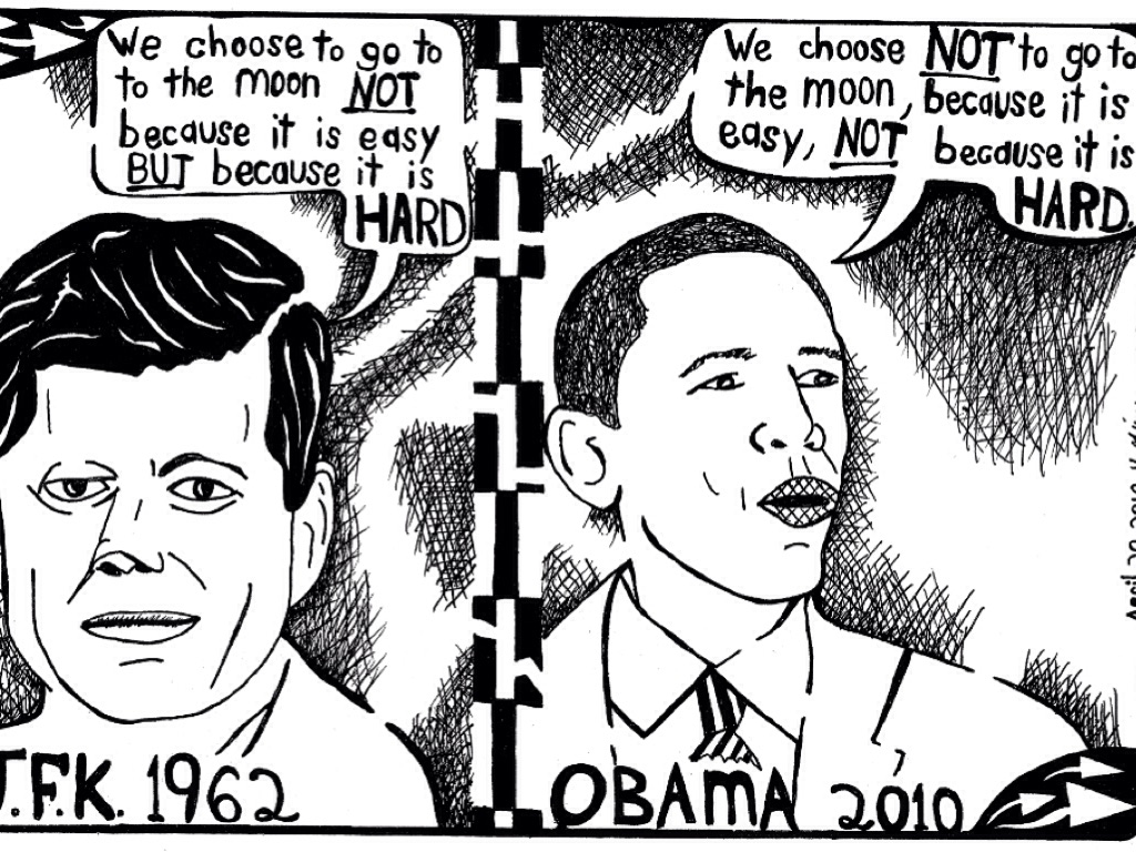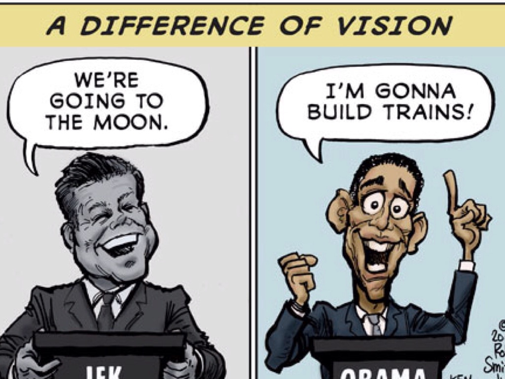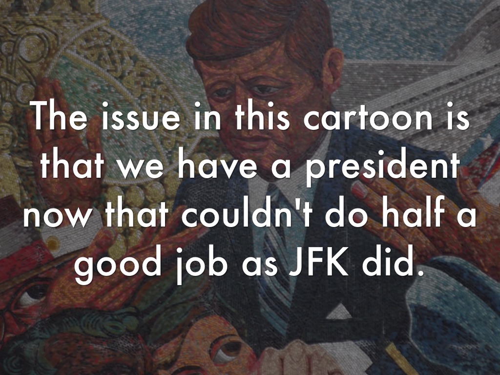 The issue in this cartoon is that we have a president now that couldn't do half a good job as JFK did.