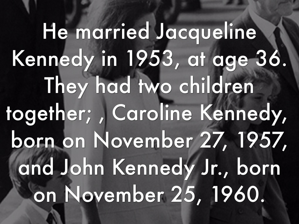 He married Jacqueline Kennedy in 1953, at age 36. They had two children together; , Caroline Kennedy, born on November 27, 1957, and John Kennedy Jr., born on November 25, 1960.