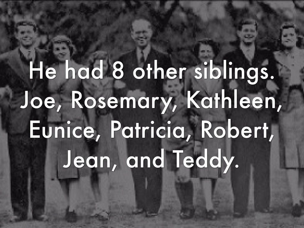 He had 8 other siblings. Joe, Rosemary, Kathleen, Eunice, Patricia, Robert, Jean, and Teddy.