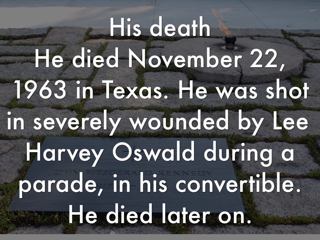 He died November 22, 1963 in Texas. He was shot in severely wounded by Lee Harvey Oswald during a parade, in his convertible. He died later on.