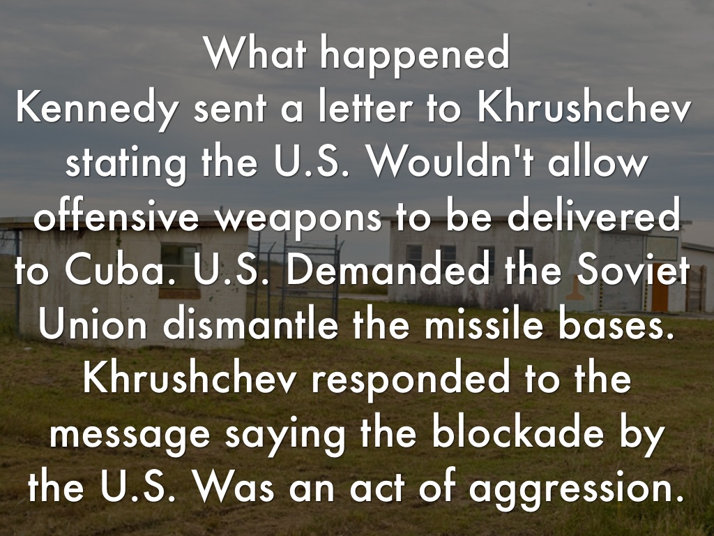 Kennedy sent a letter to Khrushchev stating the U.S. Wouldn't allow offensive weapons to be delivered to Cuba. U.S. Demanded the Soviet Union dismantle the missile bases. Khrushchev responded to the message saying the blockade by the U.S. Was an act of aggression.