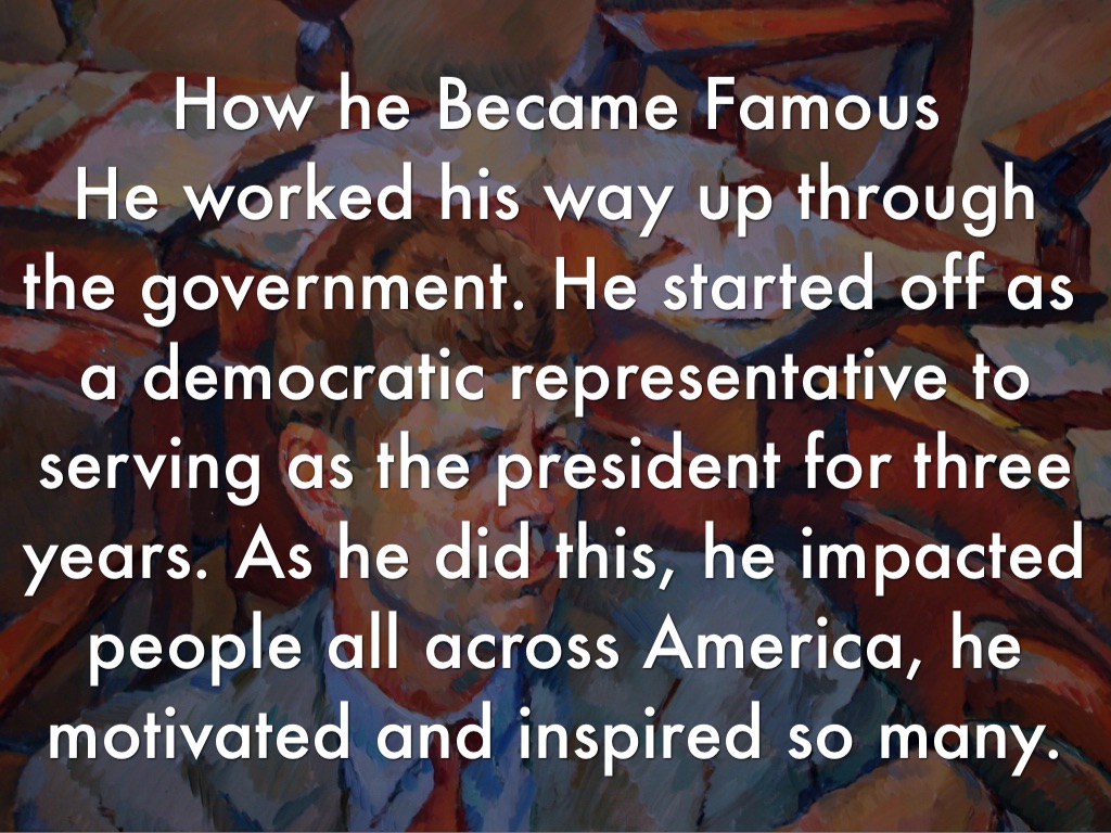 He worked his way up through the government. He started off as a democratic representative to serving as the president for three years. As he did this, he impacted people all across America, he motivated and inspired so many.