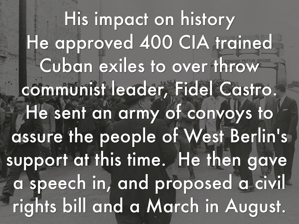 He approved 400 CIA trained Cuban exiles to over throw communist leader, Fidel Castro. He sent an army of convoys to assure the people of West Berlin's support at this time. He then gave a speech in, and proposed a civil rights bill and a March in August.