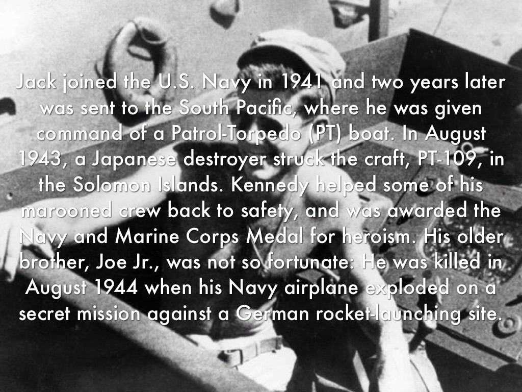 Jack joined the U.S. Navy in 1941 and two years later was sent to the South Pacific, where he was given command of a Patrol-Torpedo (PT) boat. In August 1943, a Japanese destroyer struck the craft, PT-109, in the Solomon Islands. Kennedy helped some of his marooned crew back to safety, and was awarded the Navy and Marine Corps Medal for heroism. His older brother, Joe Jr., was not so fortunate: He was killed in August 1944 when his Navy airplane exploded on a secret mission against a German rocket-launching site.