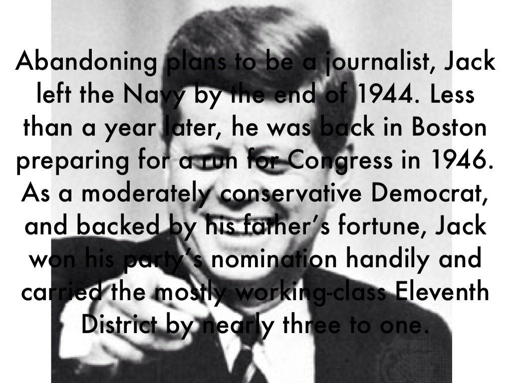 Abandoning plans to be a journalist, Jack left the Navy by the end of 1944. Less than a year later, he was back in Boston preparing for a run for Congress in 1946. As a moderately conservative Democrat, and backed by his father’s fortune, Jack won his party’s nomination handily and carried the mostly working-class Eleventh District by nearly three to one.