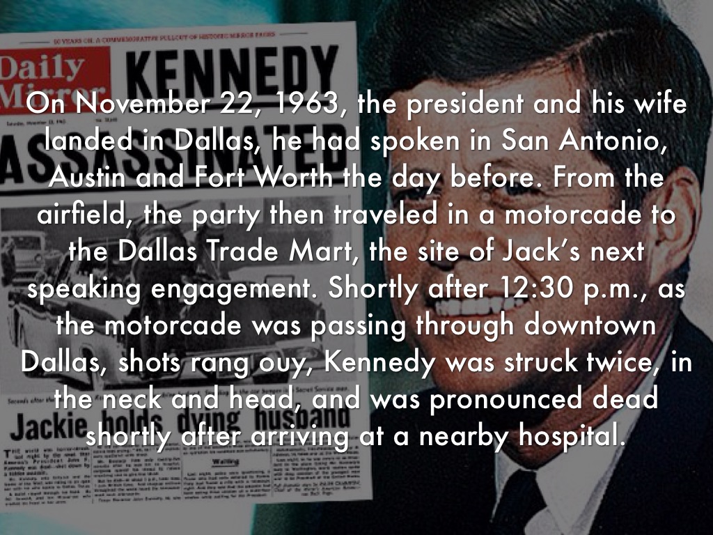 On November 22, 1963, the president and his wife landed in Dallas, he had spoken in San Antonio, Austin and Fort Worth the day before. From the airfield, the party then traveled in a motorcade to the Dallas Trade Mart, the site of Jack’s next speaking engagement. Shortly after 12:30 p.m., as the motorcade was passing through downtown Dallas, shots rang ouy, Kennedy was struck twice, in the neck and head, and was pronounced dead shortly after arriving at a nearby hospital.