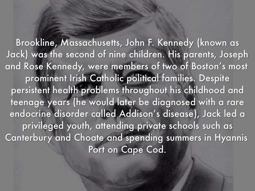Brookline, Massachusetts, John F. Kennedy (known as Jack) was the second of nine children. His parents, Joseph and Rose Kennedy, were members of two of Boston’s most prominent Irish Catholic political families. Despite persistent health problems throughout his childhood and teenage years (he would later be diagnosed with a rare endocrine disorder called Addison’s disease), Jack led a privileged youth, attending private schools such as Canterbury and Choate and spending summers in Hyannis Port on Cape Cod.