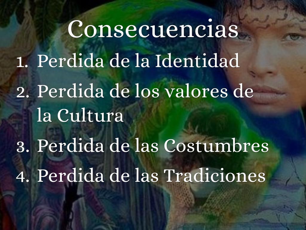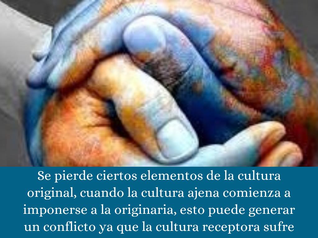 Se pierde ciertos elementos de la cultura original, cuando la cultura ajena comienza a imponerse a la originaria, esto puede generar un conflicto ya que la cultura receptora sufre una imposición.