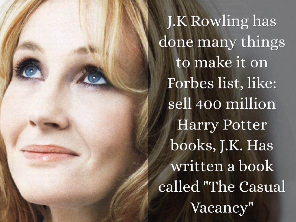 J.K Rowling has done many things to make it on Forbes list, like: sell 400 million Harry Potter books, J.K. Has written a book called "The Casual Vacancy"