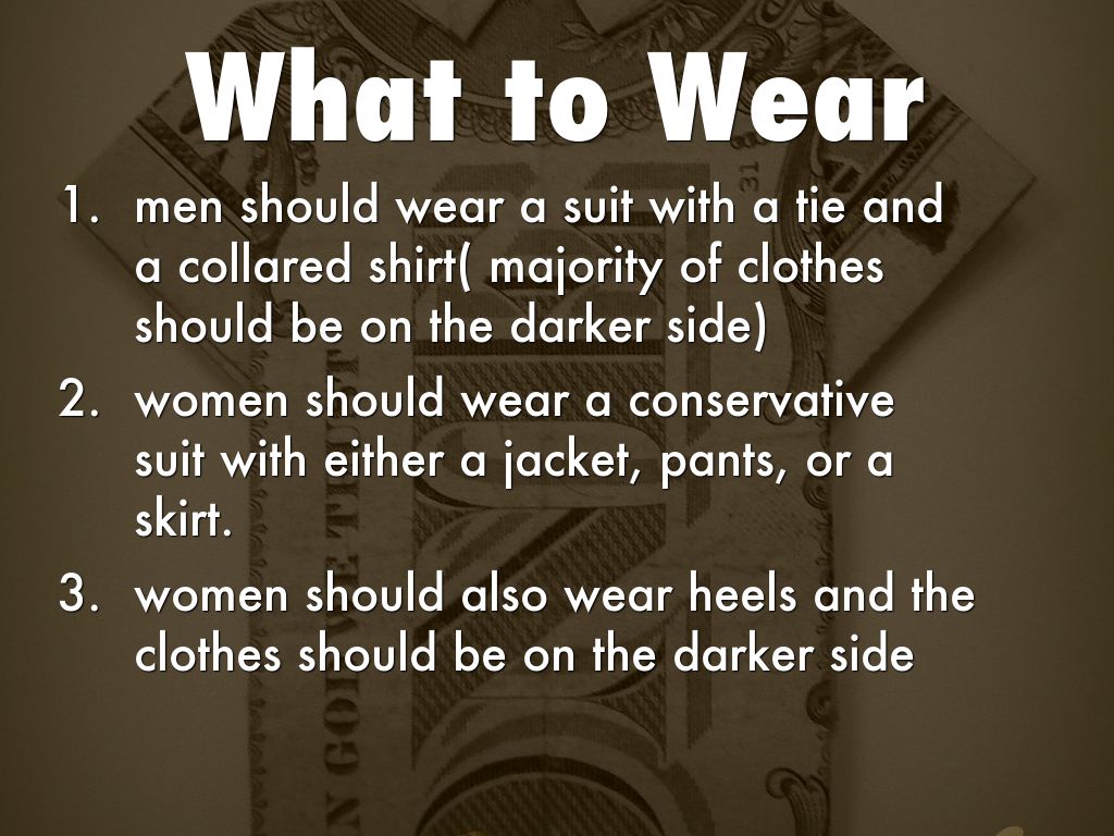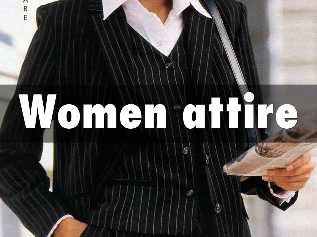 women should wear a conservative suit with either a jacket, pants, or a skirt.