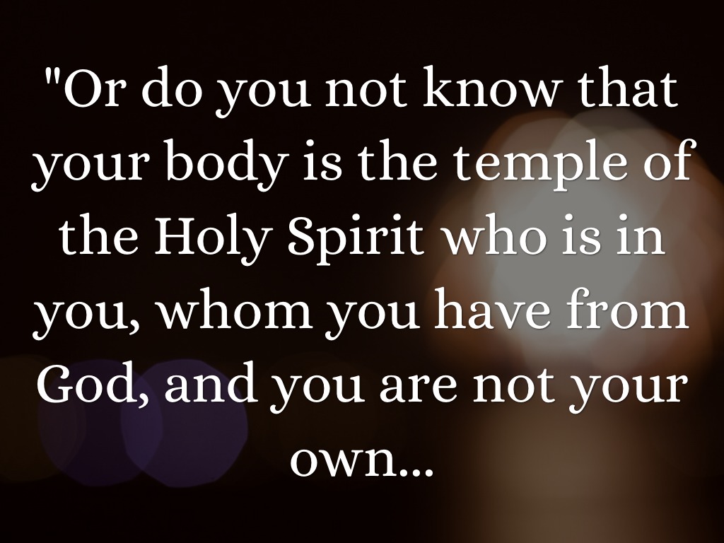 "Or do you not know that your body is the temple of the Holy Spirit who is in you, whom you have from God, and you are not your own...