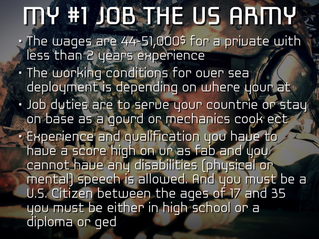 Job duties are to serve your countrie or stay on base as a gourd or mechanics cook ect