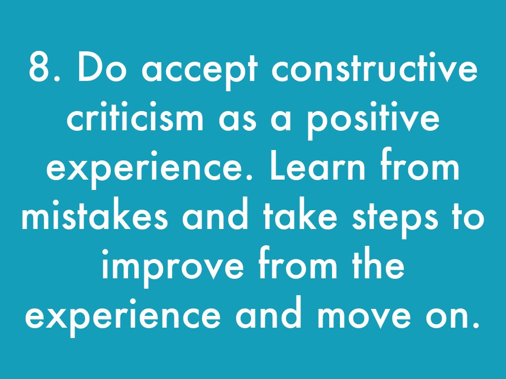 8. Do accept constructive criticism as a positive experience. Learn from mistakes and take steps to improve from the experience and move on.