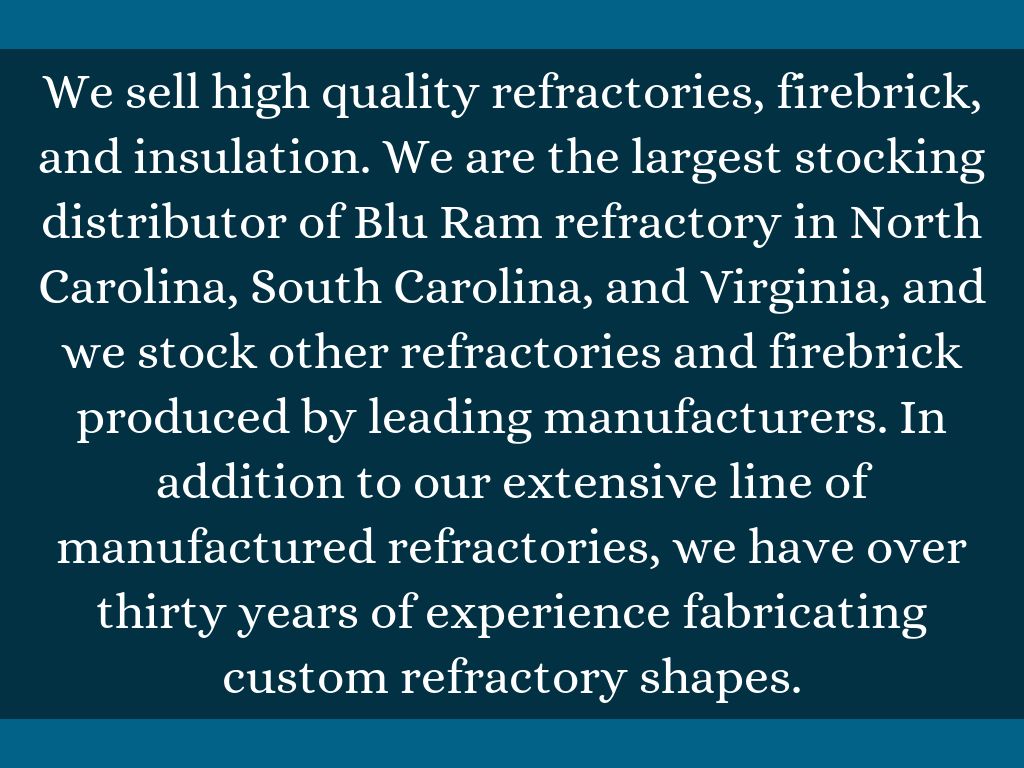 We sell high quality refractories, firebrick, and insulation. We are the largest stocking distributor of Blu Ram refractory in North Carolina, South Carolina, and Virginia, and we stock other refractories and firebrick produced by leading manufacturers. In addition to our extensive line of manufactured refractories, we have over thirty years of experience fabricating custom refractory shapes.