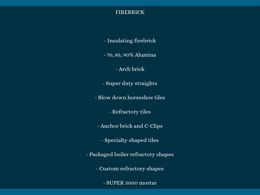 Below is a list of the refractories, firebrick, insulation, and related products we sell. Call us about pricing. (919) 832-1665.