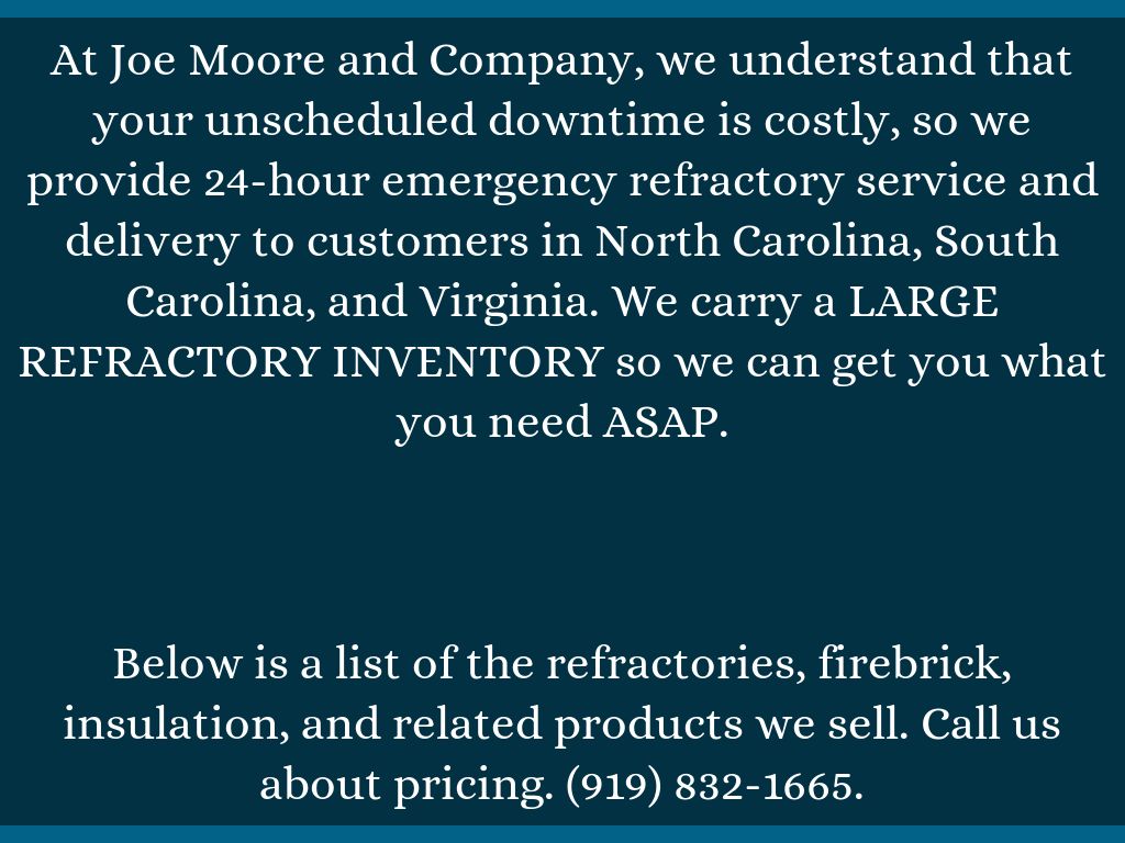 At Joe Moore and Company, we understand that your unscheduled downtime is costly, so we provide 24-hour emergency refractory service and delivery to customers in North Carolina, South Carolina, and Virginia. We carry a LARGE REFRACTORY INVENTORY so we can get you what you need ASAP.