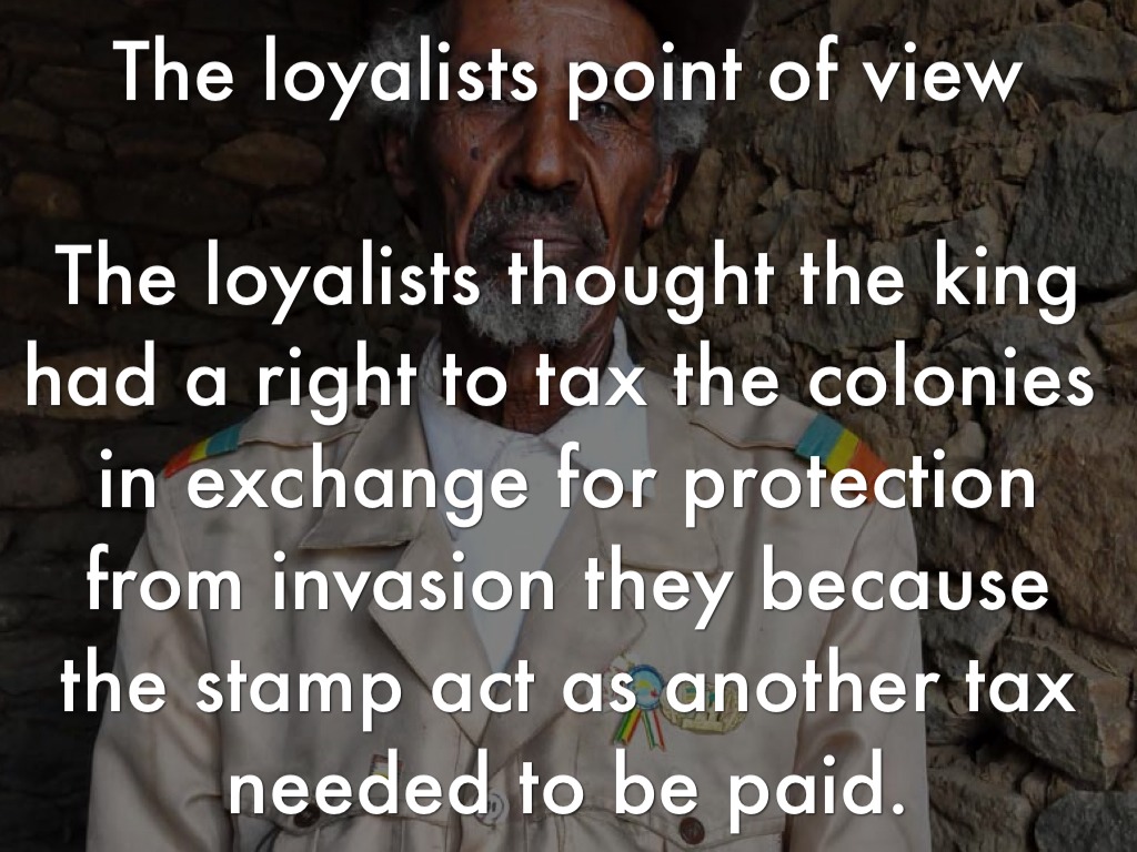 The loyalists thought the king had a right to tax the colonies in exchange for protection from invasion they because the stamp act as another tax needed to be paid.