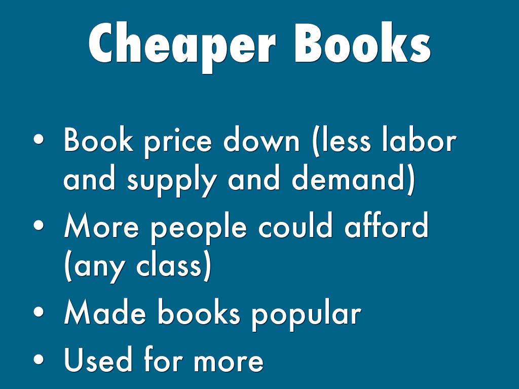 Since books had a cheaper price that means that more people could buy them no matter what class they were in.