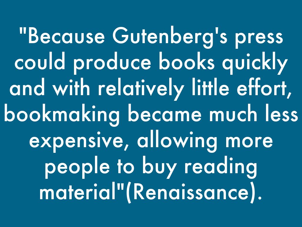 "Because Gutenberg's press could produce books quickly and with relatively little effort, bookmaking became much less expensive, allowing more people to buy reading material"(Renaissance).